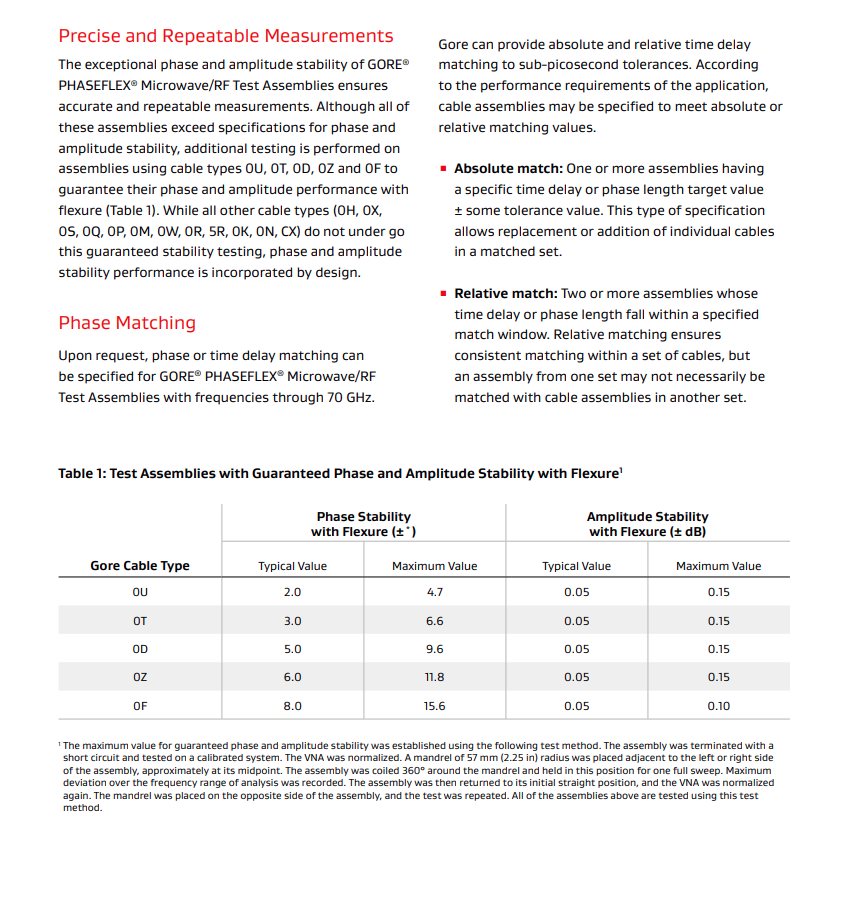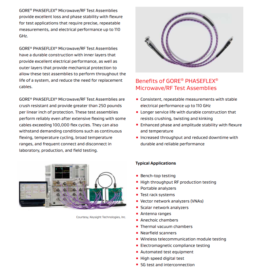 GORE® PHASEFLEX® Microwave/RF Test Assemblies provide excellent loss and phase stability with flexure for test applications that require precise, repeatable measurements, and electrical performance up to 110 GHz. GORE® PHASEFLEX® Microwave/RF Test Assemblies have a durable construction with inner layers that provide excellent electrical performance, as well as outer layers that provide mechanical protection to allow these test assemblies to perform throughout the life of a system, and reduce the need for replacement cables.