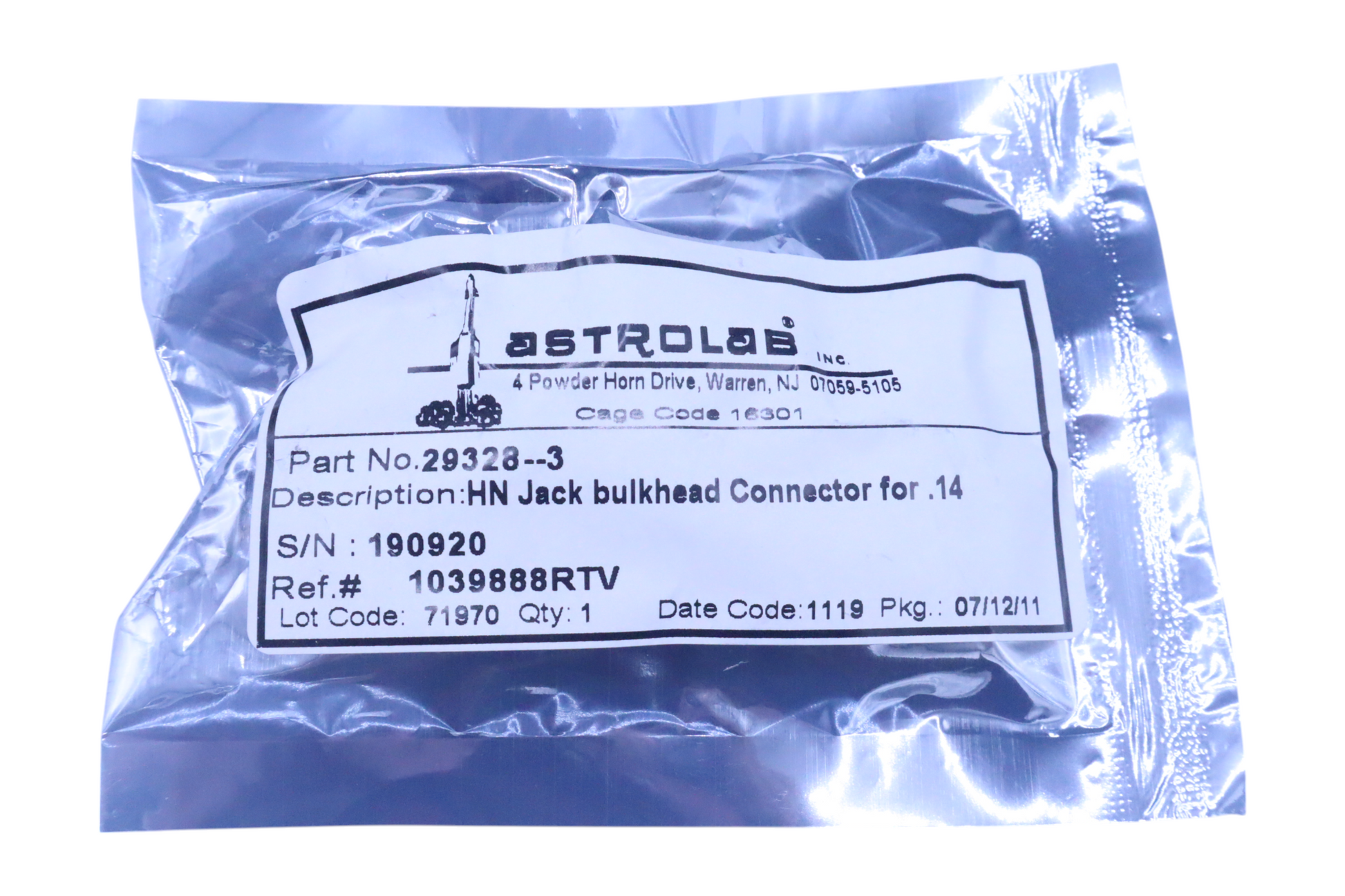 Optimize your RF connectivity with the Astrolab 29328-3 HN Jack Bulkhead Connector, engineered for reliable high-frequency performance in demanding applications. Designed for use with 0.14" diameter cables, this precision connector offers a secure and stable interface ideal for lab, military, and industrial environments.