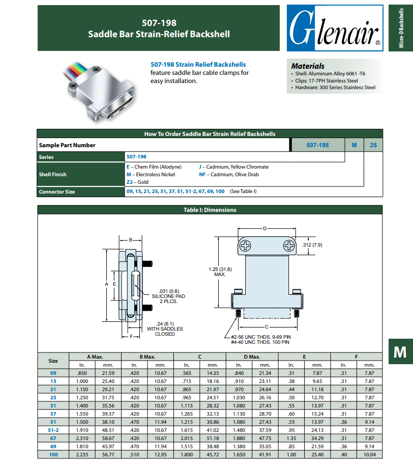 Glenair 507-198NF15 EMI Split Round Cable Entry Micro D-Sub Backshell SADDLE BAR 180°Micro-D Backshell Assembly with Strain-Relief for Un-Jacketed Wire Bundles