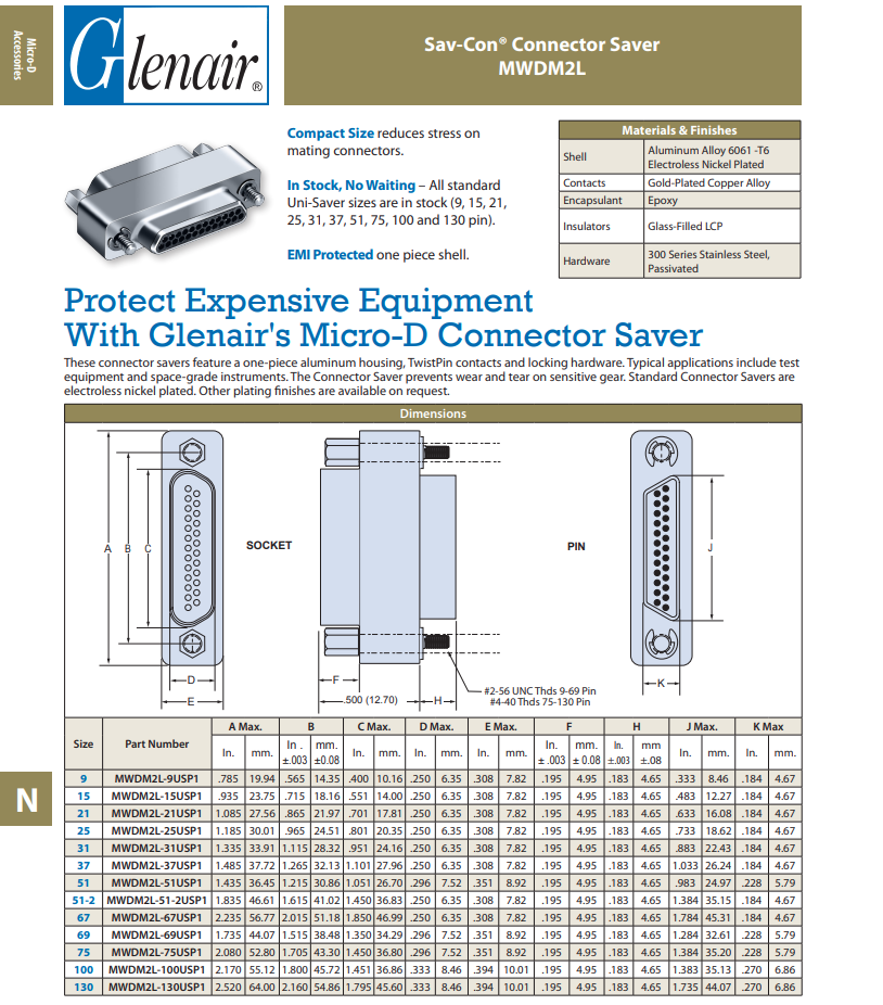 These connector savers feature a one-piece aluminum housing, TwistPin contacts and locking hardware. Typical applications include test equipment and space-grade instruments. The Connector Saver prevents wear and tear on sensitive gear. Standard Connector Savers are electroless nickel plated. Other plating finishes are available on request.