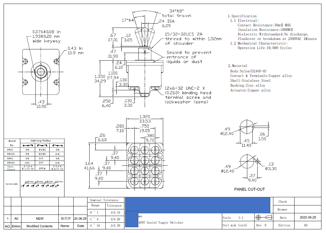 Switch type 4PDT, 4 pole toggle switch