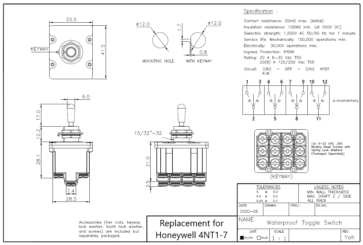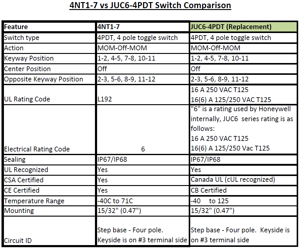 Replacement for Honeywell 4NT1-7 Toggle Switch, IP67, IP68 4PDT Momentary, 16 A @ 125/250 VAC