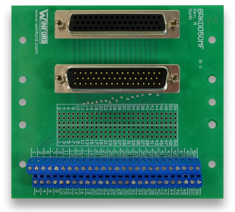 This breakout board is perfect for production applications as well as experimentation and prototype work. It is helpful for working with I/O cards, Data Aquisition (DAQ) devices, and other devices that use a DB-50 connector.